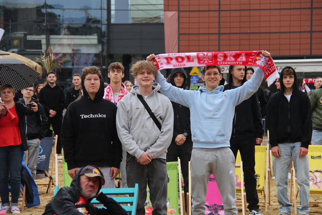 Na plaży, która w upalne dni doskonale sprawdza się jako miejsce do odpoczynku, dziś pojawiły się biało-czerwone flagi, koszulki piłkarskie oraz mocno zaciśnięte kciuki.Planów łódzkich kibiców nie pokrzyżowała także pogoda. Od niedzielnego (16 czerwca) poranka nad ziemią łódzką przemieszczały się deszczowe chmury, w efekcie do południa przez cały czas padało.
