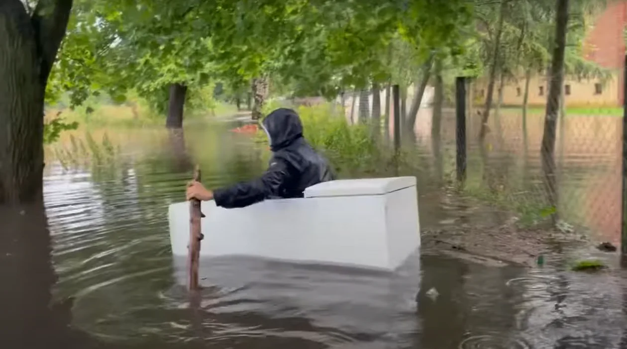 Na nagraniu widzimy mężczyznę ubranego w czarną odzież, który płynie swoją „barką” używając konarów drzew zamiast tradycyjnych wioseł. Tym razem na brzegu jej nie zostawił, a stale próbował płynąć dalej. Jego „barką” okazała się być lodówka.