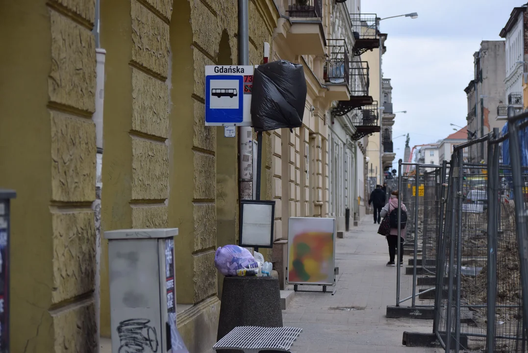 Na ul. Legionów, śmietniki także są przepełnione, a widać to nawet przy zawieszonym przystanku MPK.