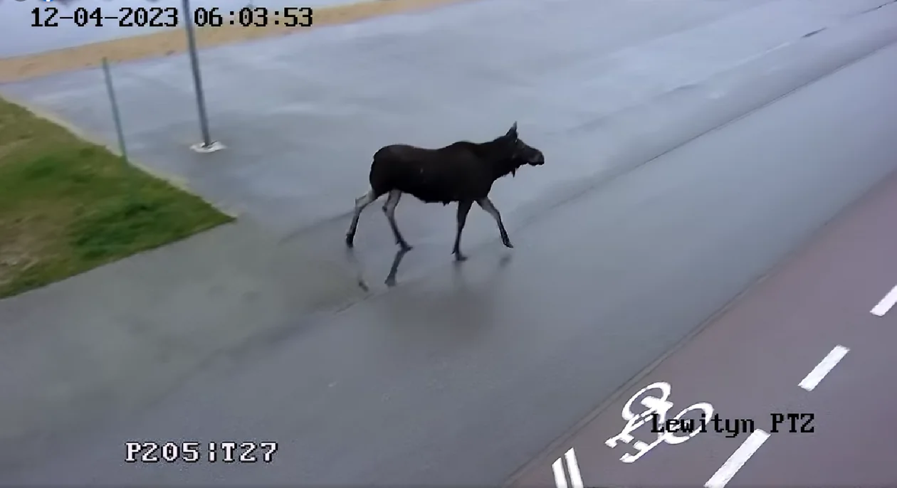 Nagranie z monitoringu miejskiego, przedstawiające jak łoś spaceruje po Lewitynie znajdziecie poniżej: