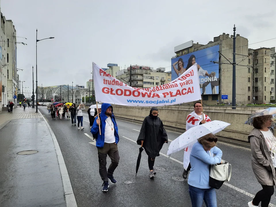 Demonstracja zaczęła się o 14.30 przed siedzibą łódzkiego MOPS-u przy ulicy Kilińskiego 102/102a. Deszczowa pogoda nie przeszkodziła w manifestacji. Strajkujący, uzbrojeni w gwizdki i parasolki, przeszli ulicami miasta. Przemieszczali się między innymi Kilińskiego, Piłsudskiego oraz Mickiewicza.