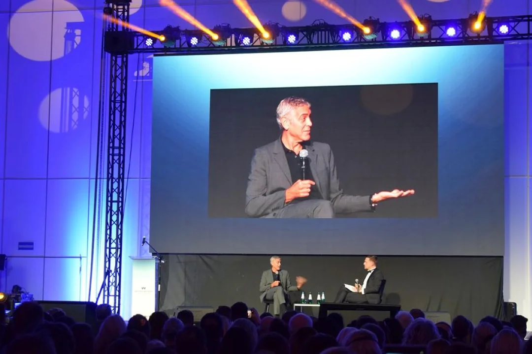 Clooney przyleciał do Łodzi prywatnym odrzutowcem już w piątek, a na scenie w hali Expo przywitała go prezydent Hanna Zdanowska.