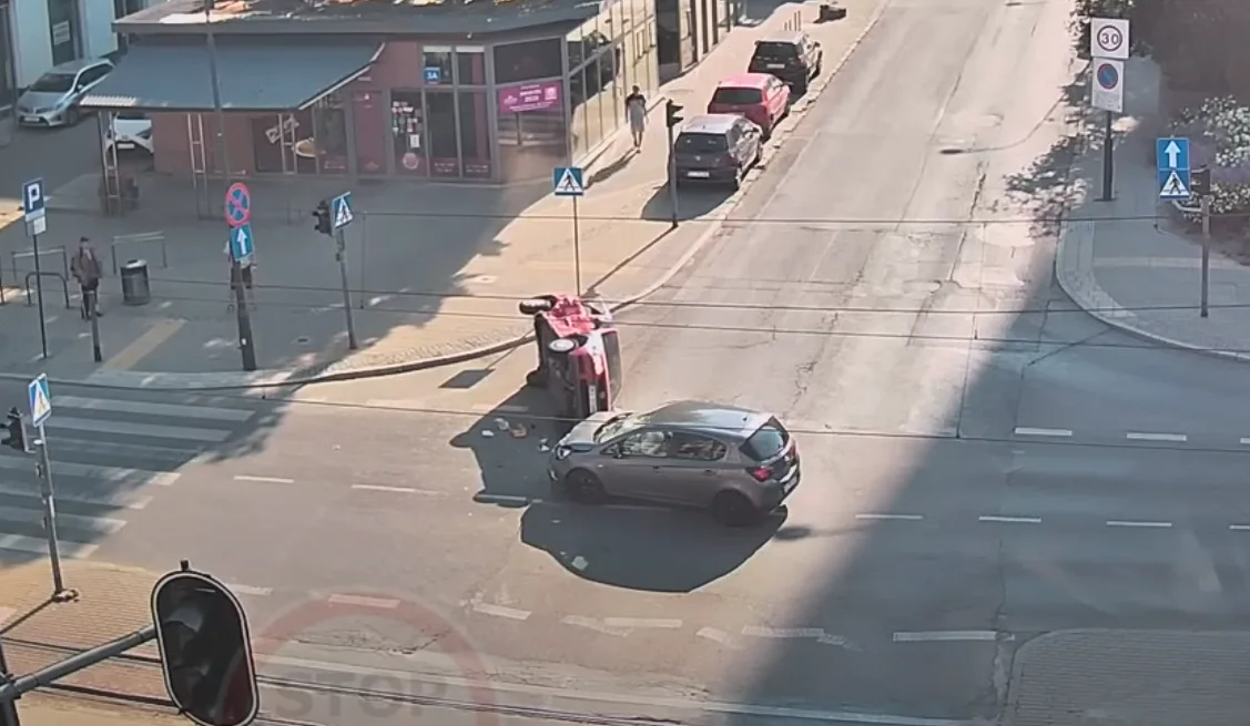 Na nagraniu trwającym ponad minutę możemy zobaczyć nie tylko moment zderzenia, ale i reakcję obecnych na miejscu pieszych. Od momentu zderzenia słychać dźwięk klaksonu samochodowego, który został uruchomiony na skutek obrócenia pojazdu.