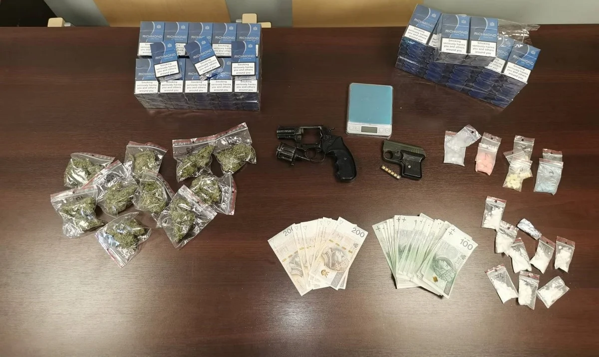 Podczas przeszukania policjanci znaleźli w mieszkaniu pistolet i rewolwer z amunicją oraz, ukryte w skrytce, kilka tysięcy złotych. Zabezpieczyli także klucze, po czym sprawdzili je w zamku do komórki – jak się okazało, ukryte zostały tam papierosy bez polskich znaków akcyzy, torebeczki z marihuaną, amfetaminą i tabletkami odurzającymi. 25-latka i 32-latek zostali zatrzymani. Lokal został dokładnie przeszukany przy pomocy służbowego psa, wyszkolonego pod kątem wykrywania narkotyków. Łącznie policjanci zabezpieczyli prawie 60 gramów marihuany, ponad 45 gramów amfetaminy i 79 tabletek MDMA. Oprócz zarzutów o posiadanie narkotyków, 32-latek odpowie również za jazdę samochodem bez uprawnień – jak się okazało, mężczyzna przyjechał na miejsce z egzaminu na prawo jazdy z Łodzi. Za posiadanie znacznej ilości narkotyków i ich rozprowadzanie grozi mu nawet do 10 lat pozbawienia wolności. W Aleksandrowie Łódzkim zatrzymano także 37-latka, prawdopodobnie klienta 32-latka – funkcjonariusze zabezpieczyli u niego między innymi marihuanę i rewolwer. Mężczyźnie grozi do 3 lat pozbawienia wolności.