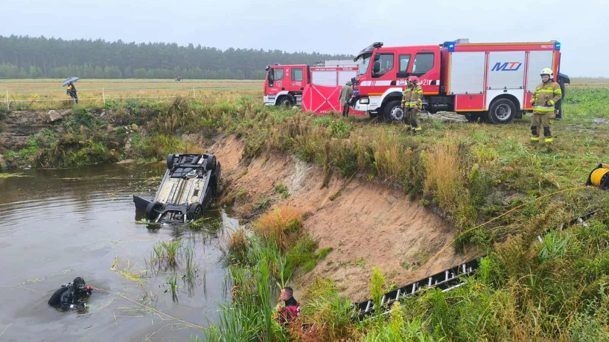 Straż pożarna została poinformowana o aucie w stawie w miejscowości Drobnice (gmina Osjaków, powiat wieluński). Zgłoszenie wpłynęło w sobotę 6 września około godz. 7:19.