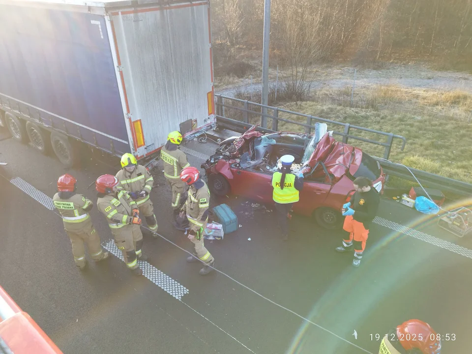Wcześniej strażacy wyciągnęli samochód osobowy spod naczepy ciężarówki. Na miejscu pracują cztery zastępy PSP, dwa OSP, zespół ratownictwa medycznego oraz załoga LPR. Przed węzłem Emilia wyświetla się komunikat o utrudnieniach. Ruch odbywa się pasem lewym.Do godz. 7.30 w województwie łódzkim doszło do 14 zdarzeń drogowych.