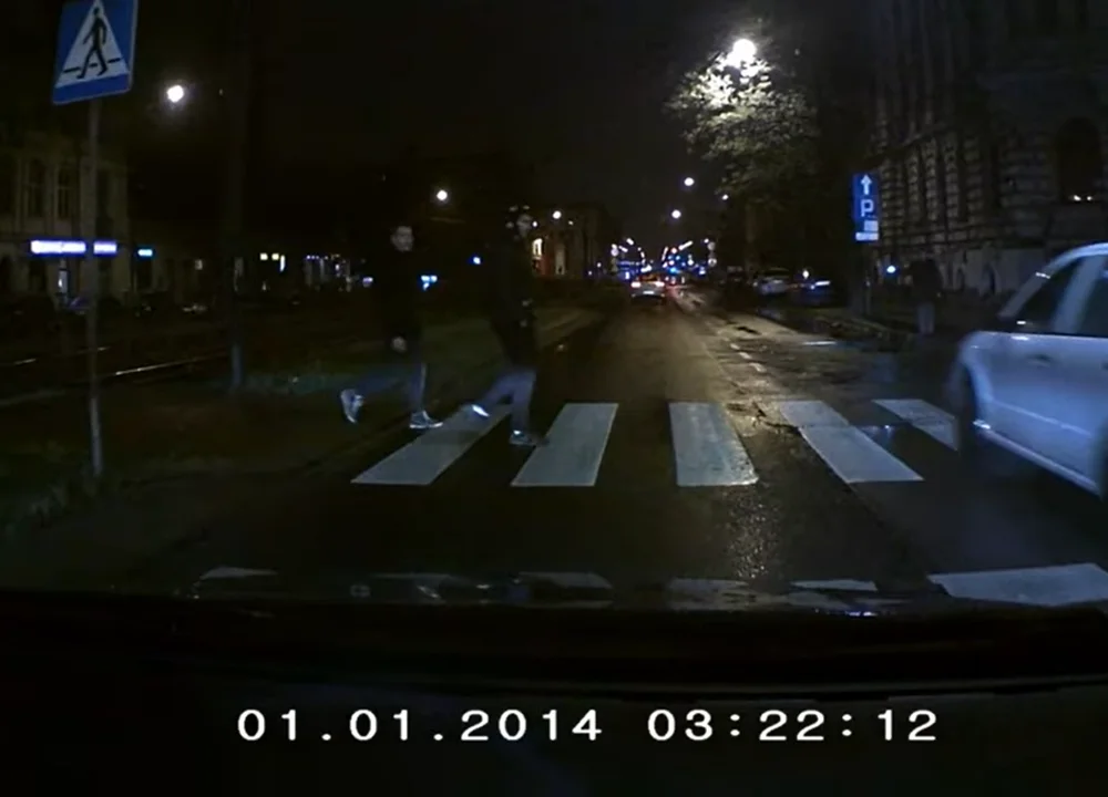 Na filmie z kamery samochodowej obserwujemy, że kierowca zatrzymuje się przed przejściem dla pieszych, by przepuścić wchodzące na nie dwie osoby.