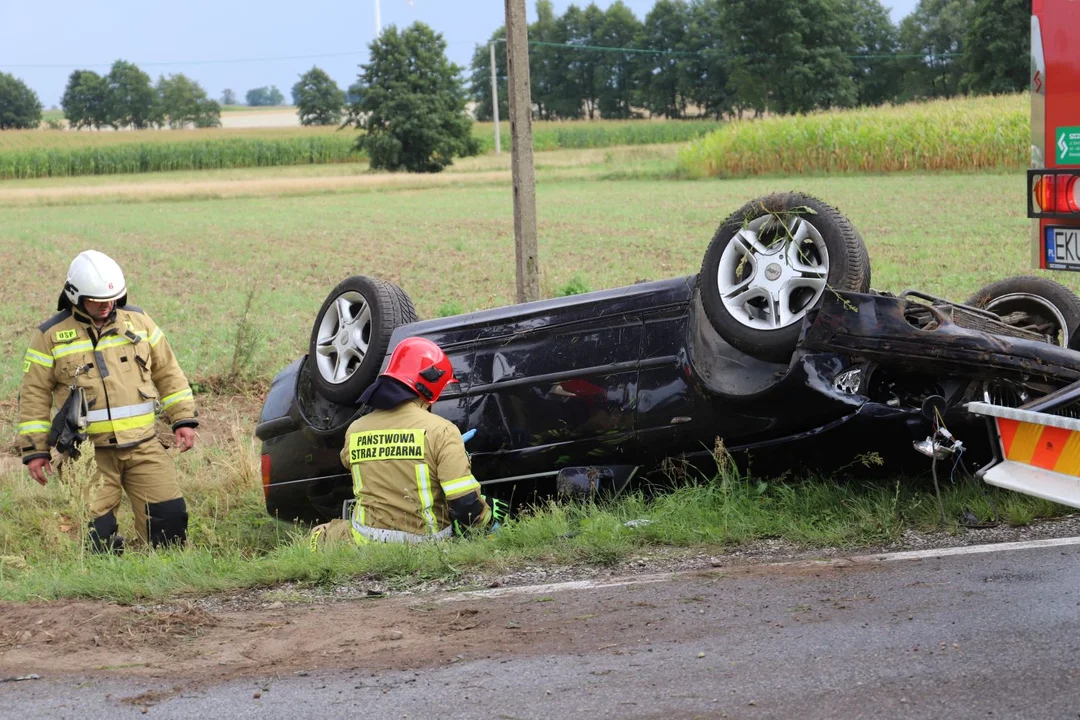 Z nieustalonych na chwilę obecną przyczyn kierowca osobowego BMW stracił panowanie nad pojazdem, wypadł z drogi i dachował.