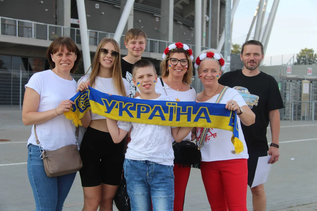 Pani Justyna przyjechała do Łodzi ze znajomymi z Bydgoszczy. Grupa polsko-ukraińska bardzo dobrze się przygotowała do sportowych emocji. Szaliki, koszulki, barwy narodowe na policzkach.
