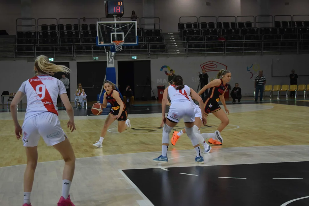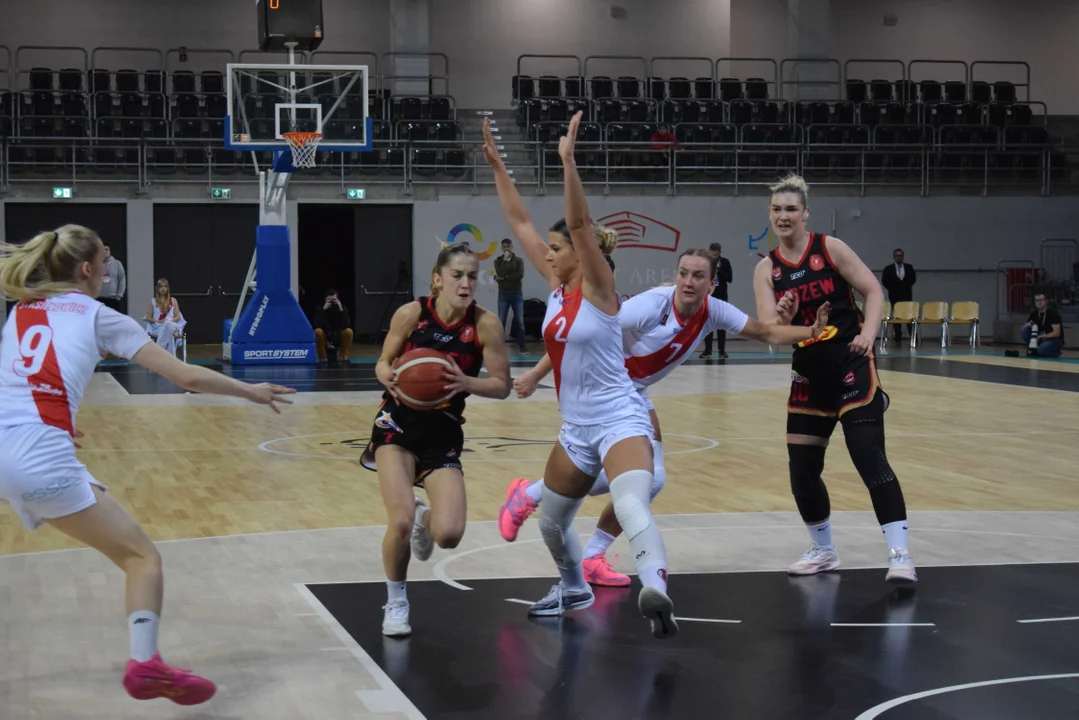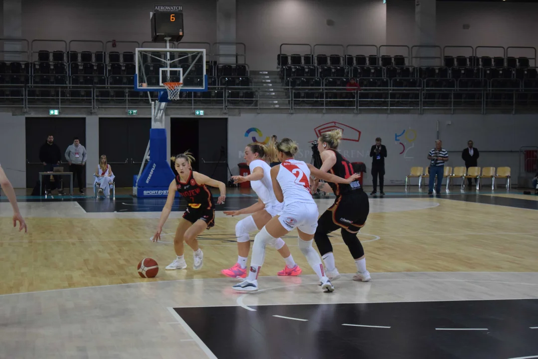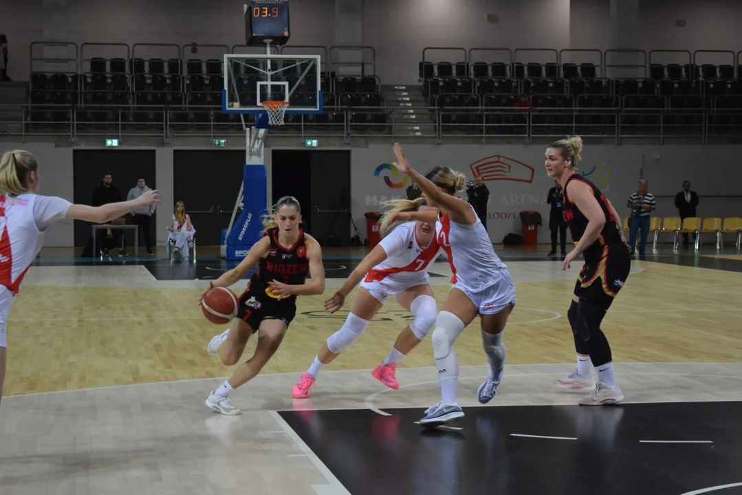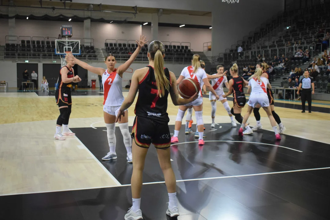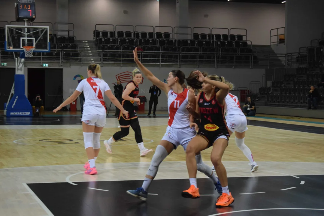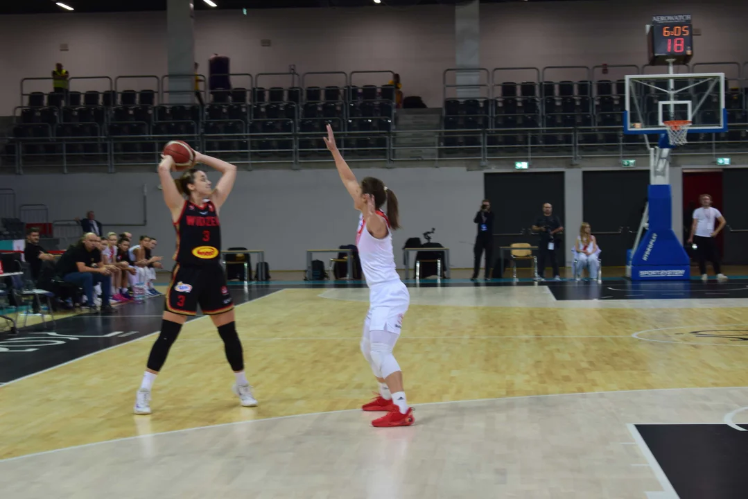 Początek meczu należał do przyjezdnych, a główną bohaterką pierwszych minut była Julia Drop. Doświadczona rozgrywająca, która po pięciu latach ponownie wystąpiła w barwach Widzewa, od razu zaznaczyła swoją obecność. W pierwszej kwarcie zdobyła 13 punktów.W końcówce pierwszej kwarty gospodynie zaczęły skuteczniej bronić i wykorzystywać błędy rywalek. Po punktach Wiktorii Puchacz wynik wyrównał się na 17:17, jednak Widzew zdołał odzyskać przewagę i zakończył pierwszą część meczu prowadzeniem 19:17.