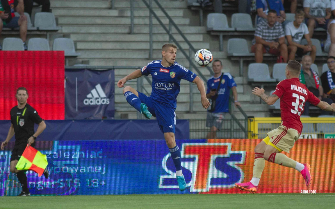 Od początku spotkania ŁKS pokazywał, że do Legnicy przyjechał po pełną pulę punktów. Po pierwszym naporze gospodarzy, do śmiałych ataków ruszyli łodzianie i przy odrobinie szczęścia szybko mogli objąć prowadzenie. Najpierw w znakomitej pozycji tuż obron bramki Jędrzej Zając zdecydował się odegrać do pilnowanego Arasy, a kilka chwil później Antoni Młynarczyk wymusił błąd rywala, ale nie zdołał przyjąć piłki w bardzo dobrym położeniu.