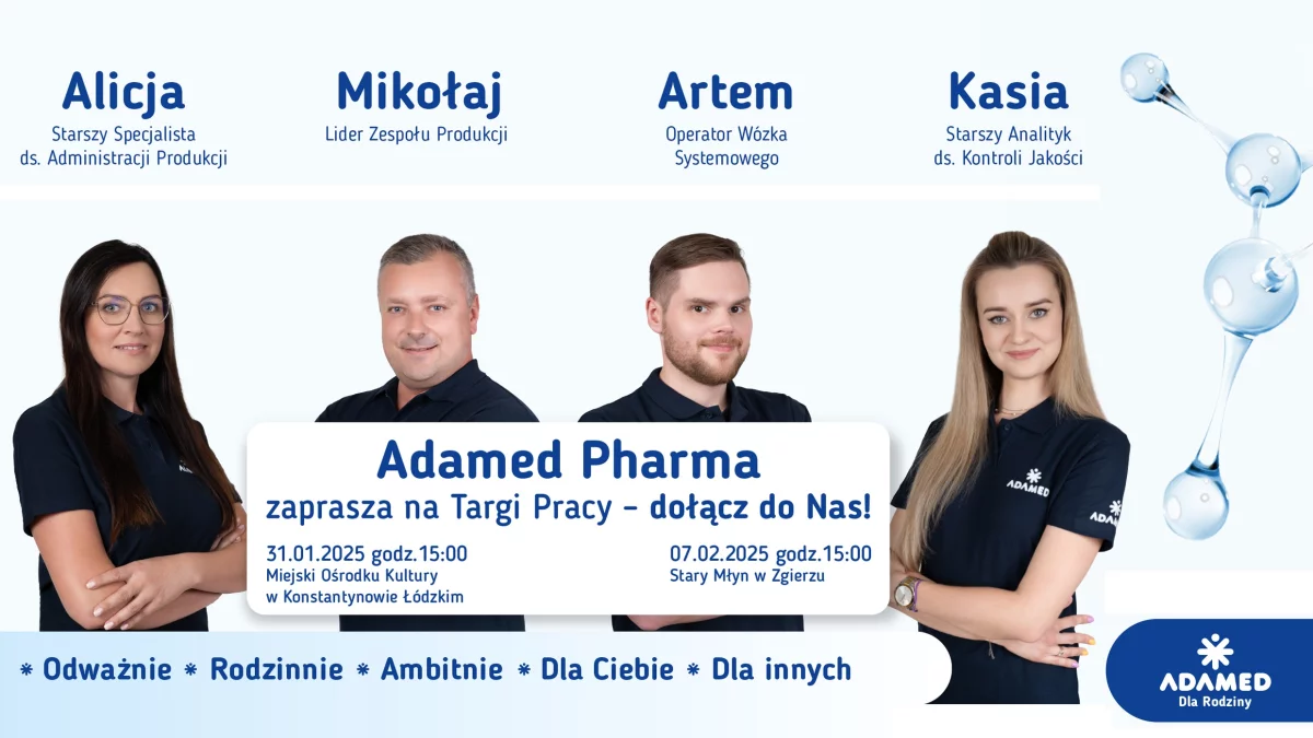 W piątek 31 stycznia o godz. 15:00 w Miejskim Ośrodku Kultury przy ul. Łódzkiej 28 w Konstantynowie Łódzkim oraz w piątek 7 lutego o godzinie 15:00 w Starym Młynie przy ul. Długiej 41A w Zgierzu, odbędą się Targi Pracy organizowane przez Adamed Pharma. To doskonała okazja, aby dowiedzieć się, jak wygląda praca w wiodącej firmie farmaceutycznej w Polsce oraz jakie korzyści niesie ze sobą dołączenie do Zespołu Adamed.
