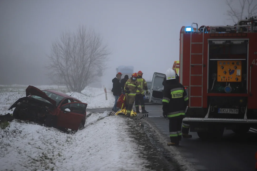 Zdarzenie miało miejsce ok. godz. 10:30 na wysokości miejscowości Rybie (gmina Krzyżanów, powiat kutnowski). Na chwilę obecną wiadomo, że zderzyły się ze sobą dwa auta osobowe. Siła uderzenia sprawiła, że jedno z nich wpadło do rowu.