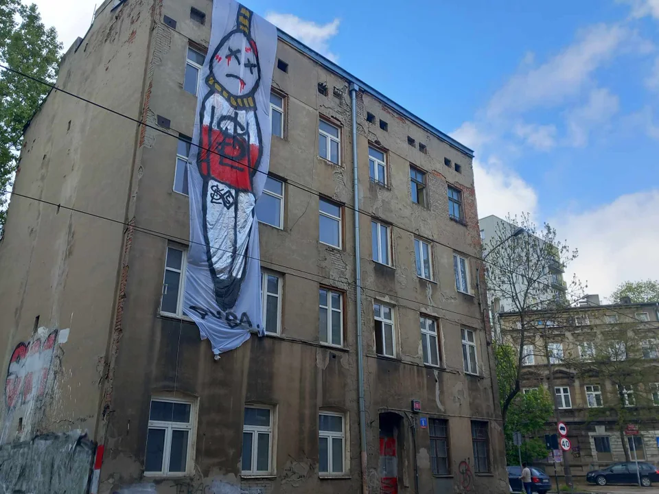 Gigantyczna płachta zwisająca z dachu do wysokości pierwszego piętra wisi na elewacji kamienicy od kilku dni i wzbudza zainteresowanie przechodniów. Namalowano na niej podobiznę powieszonego człowieka w biało czerwonym uniformie, na którego piersi znajduje się napis ŁKS. Jak udało nam się nieformalnie dowiedzieć, autorami „instalacji” są prawdopodobnie kibice Widzewa Łódź.