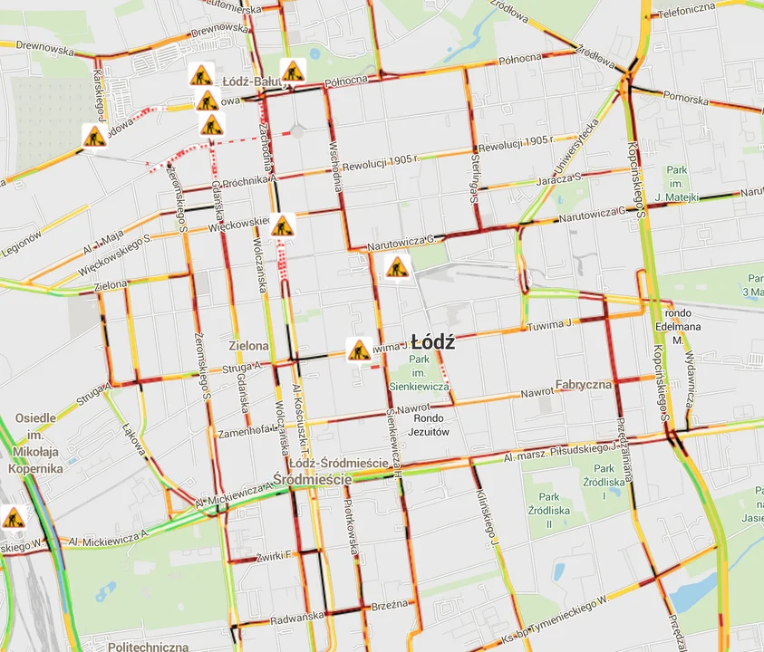Jak wskazuje aplikacja traffic.naviexpert około godz. 15. Najbardziej zatłoczonymi ulicami są al. Kościuszki, ul. Narutowicza, ul. Sienkiewicza, al. Piłsudskiego i Mickiewicza, ul. Wróblewskiego i Żeromskiego oraz Wschodnia. Wolniej pojedziemy również ulicami: Przybyszewskiego, Piotrkowską, Niciarnianą, Zachodnią, Północną i Radwańską. Warto uważać też na korki na ul. Próchnika i Gdańskiej przy skręcie w tę pierwszą. W godz. szczytu można utknąć tam na nawet na kilkanaście minut.