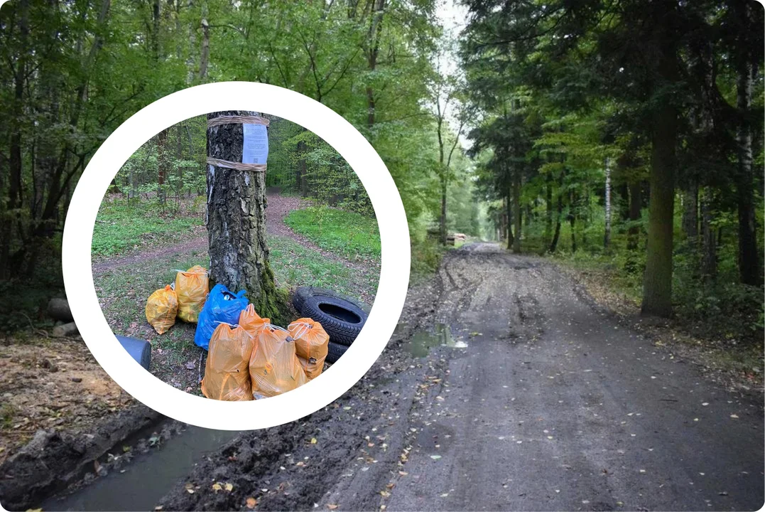 Promujemy spacery po lasach, połączone ze zbieraniem drobnych śmieci (szklane butelki, puszki, plastikowe opakowania itp.) oraz zgłaszanie składowisk odpadów np. opon, śmieci budowlanych, za pomocą aplikacji mObywatel. Dołącz do nas!