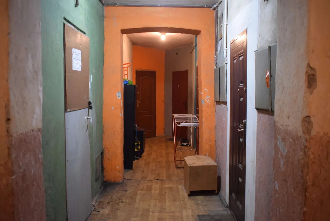 Mijając bramę widać otynkowanie, które ma zakryć pęknięcia. Pozostają jeszcze ubytki i dziury w elewacji, które również mają zostać załatane. W budynku przy ulicy Szerokiej znajduje się szesnaście mieszkań. Większość z nich wymaga remontu, ale już sama klatka schodowa jest w bardzo złym stanie.
