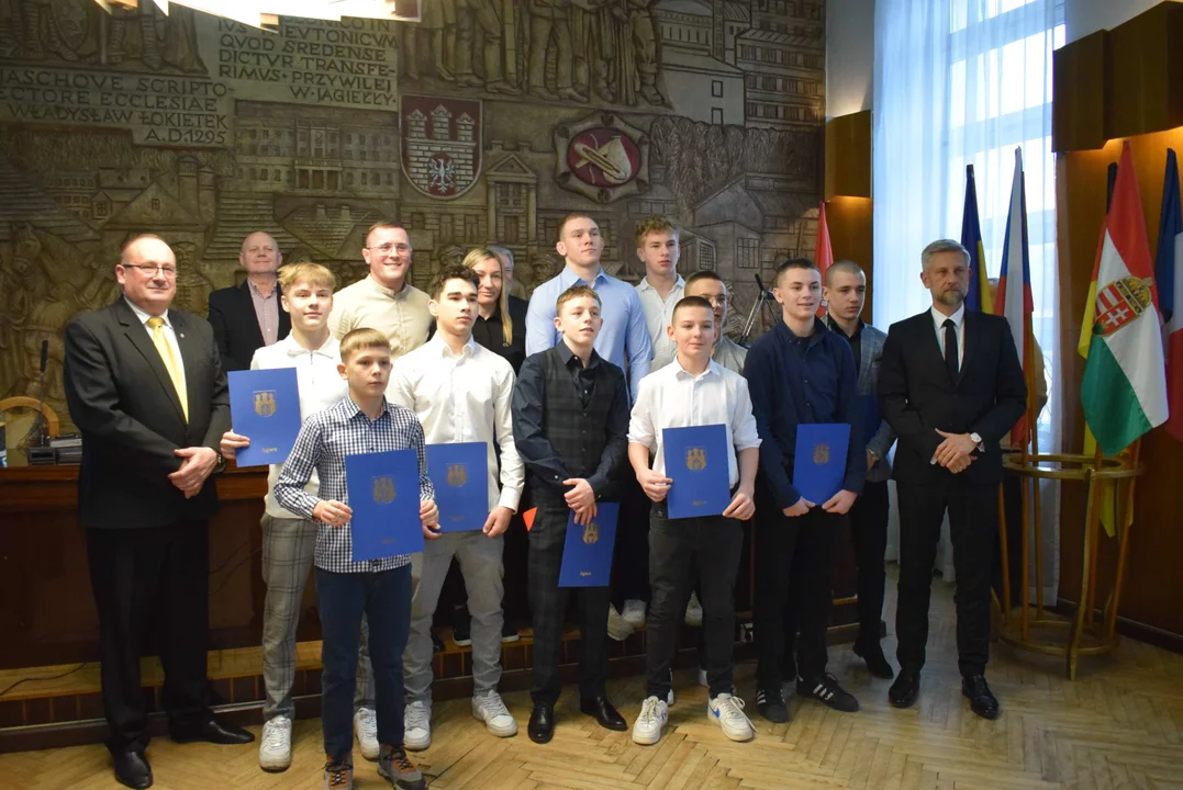 Prezydent Przemysław Staniszewski oraz Grzegorz Leśniewicz przewodniczący Rady Miasta Zgierza wręczyli stypendia Rady Miasta Zgierza młodym sportowcom 29 lutego w urzędzie miasta.
