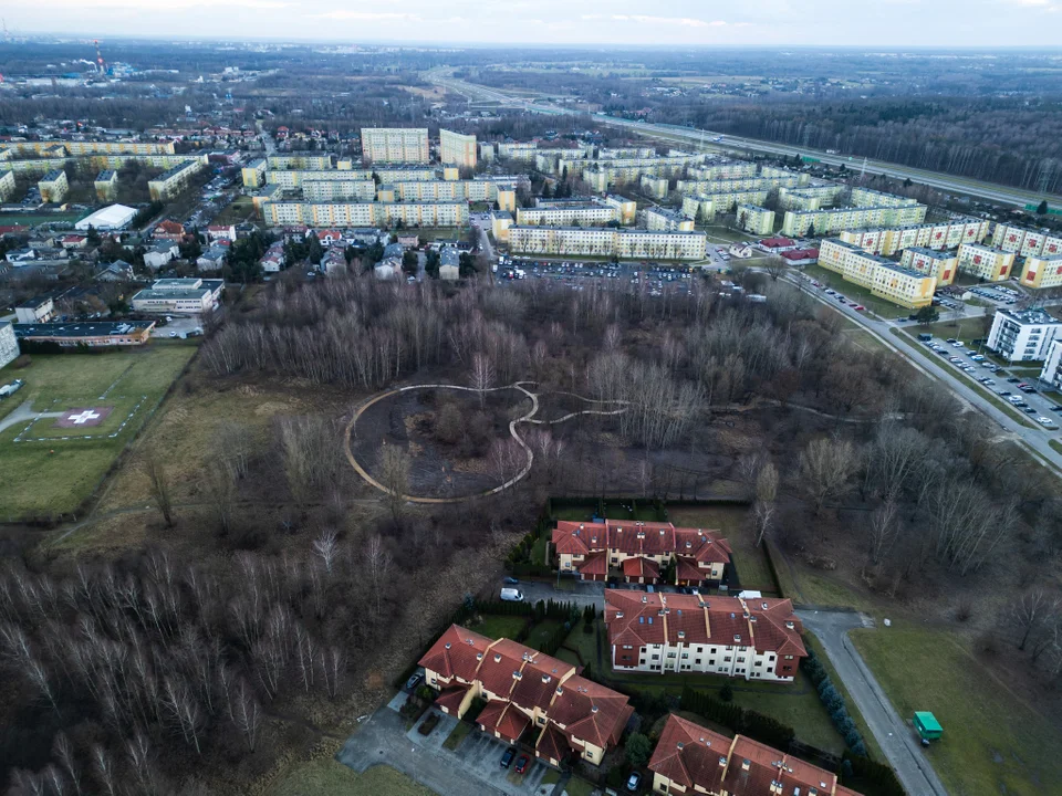 Na zdjęciu z lotu ptaka widać, że ścieżki tworzą kształt pętli, z wejściem od strony ulicy Boya-Żeleńskiego.