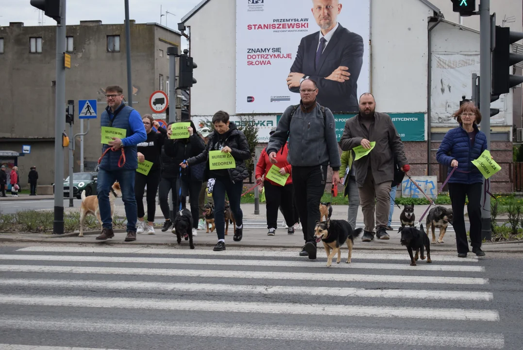 W asyście policji o godzinie 14 spod schroniska Medor wyruszyło kilkanaście osób wraz z psami i wypisanymi na kartkach hasłami wspierającymi fundację. Maszerowali pod urząd miasta, by wyrazić swój sprzeciw przeciwko likwidacji schroniska i zakończeniu dzierżawy terenu od miasta.