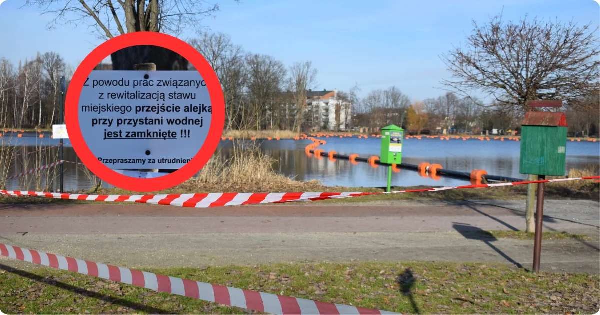 Z powodu prac związanych z rewitalizacją stawu miejskiego przejście alejką przy przystani wodnej jest zamknięte.