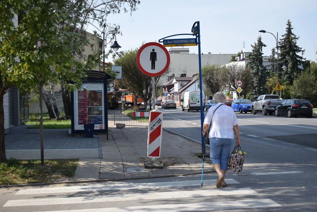 Od strony ulicy Skłodowskiej-Curie płyty chodnikowe jeszcze nie zniknęły, ale ustawiono taki sam znak. Sęk w tym, że tuż za nim jest przystanek [Długa - Skłodowskiej-Curie (3029)].