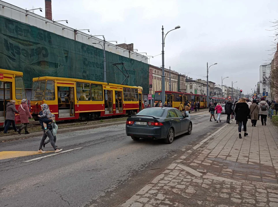 Pasażerowie wysiedli z tramwajów i ruszyli pieszo w stronę Manufaktury.